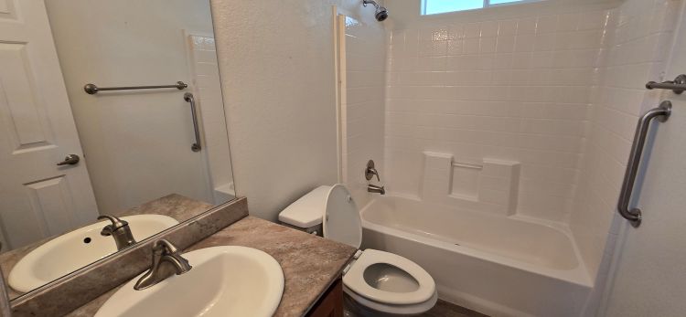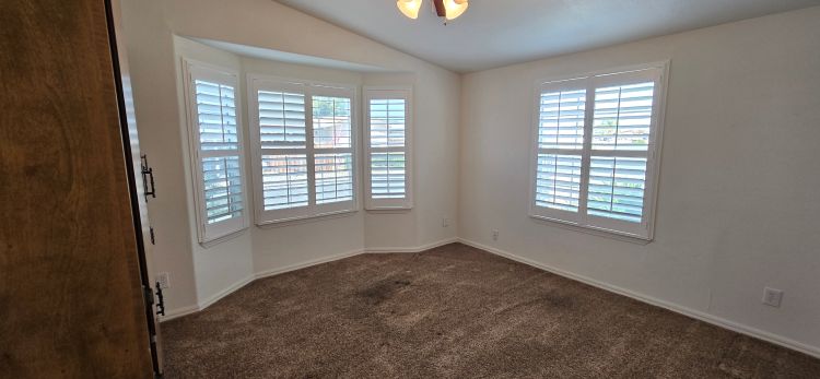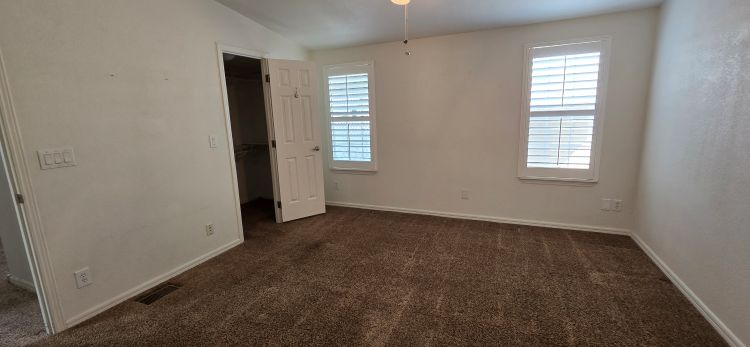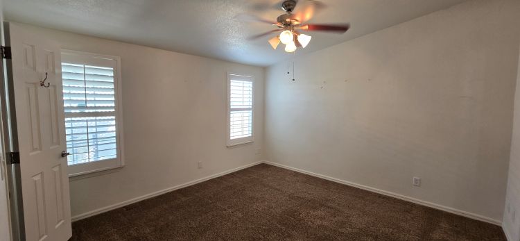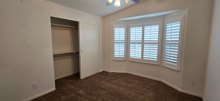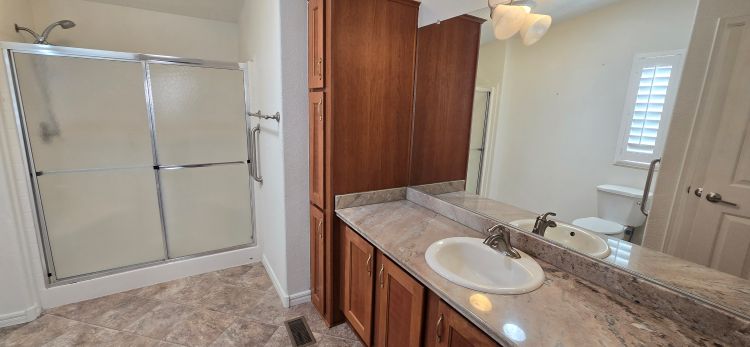 Two bedrooms and guest bathroom up front. Guest bathroom features tub-shower. Large master bedroom in back with walk-in closet. Master bathroom has full shower. Great patio and tuff shed for storage.