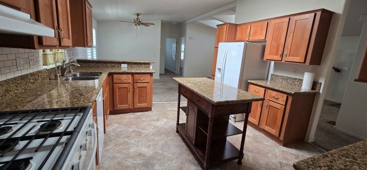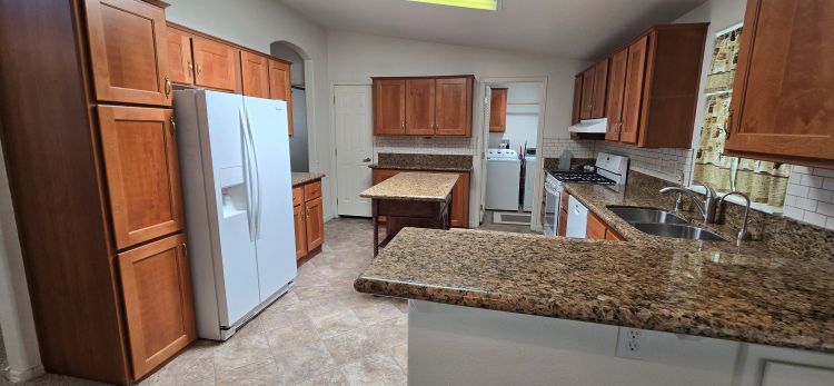 This is a 3 bedroom, 2 bath split-wing home is located next to pool/pool clubhouse and features dual-pane windows, vaulted ceilings, skylights and plantation shutters. Kitchen has island, granite countertops and includes range, refrigerator, dishwasher, stainless sink, lots of cabinets and is open to dining/living. Laundry room has both washer and dryer.