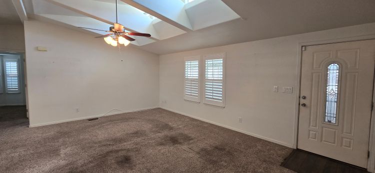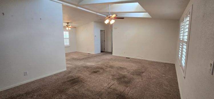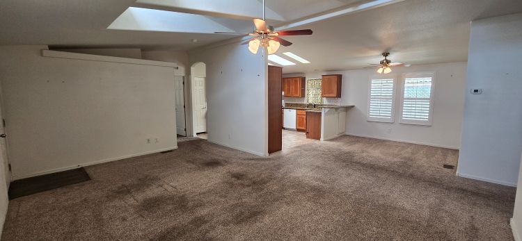 This is a large 2 bedroom/2 bathroom home. Owner has painted and installed new carpeting. The kitchen is open to the dining and den. Kitchen has range and dishwasher. There is water-proof laminate in the kitchen, den and master bedroom. Master bedroom is large with lots of closets and the master bath has dual sinks and separate toilet and new double shower. Roof resurfaced in last year. The heating and air conditioning unit was replaced in 2025. This home won’t last long.