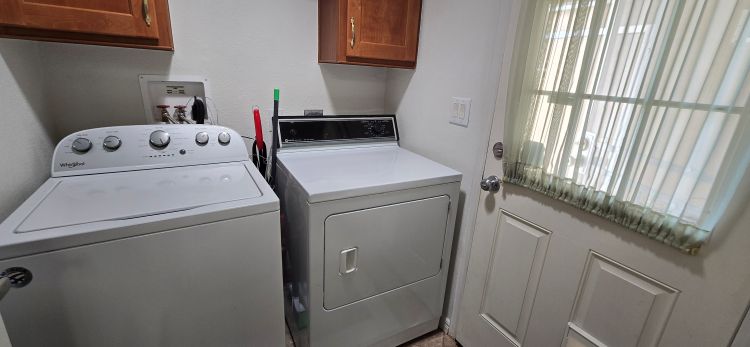 This beautiful 2 bedroom, 1 bath, home features dual-pane windows. Kitchen includes refrigerator, range microwave, disposal, washer and dryer located in kitchen behind sliding doors. Large guest bedroom has walk-in closet. Primary bedroom is large and has walk-in closet as well. Bathroom has full shower. New roof last year. Great patio and large back yard.